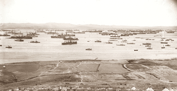 Then we marched to the station and entrained for Alexandria. There I posted a card to say that we had embarked on S.S. Suffolk – ‘a rotten old tub, not nearly as good as the Ascanius; but no doubt we shall survive’. It was to be our home for the next eight weeks. We sailed with three other ships carrying the rest of the 3rd Bde and arrived some days later at Mudros, on the island of Lemnos. There we found a very large harbour, with a narrow entrance; a suitable assembly place for a large fleet. But when we arrived it was empty except for one or two small naval vessels.