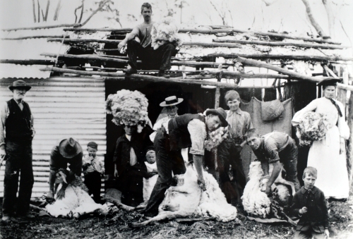 The image at left shows the Broomehill Farm - the Green Family men shearing c.a. 1903 - George (PG) is the shearer facing camera on the right. (Image courtesy Noreen Baxter)
