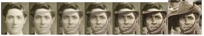 Finding Cyril in the Cheops Pyramid image was much like finding other men in the photo - somewhat difficult to determine where he was, and when found to confirm that he is the correct person. Having a contemporary and clear image of Cyril proved to be critical and compelling evidence, this was the photo taken at his sisters wedding in 1913. Using a stepped over-lay of the wedding photo, against potential candidates in the Cheops photo, revealed a perfect match for Cyril, as can be seen in the example below;